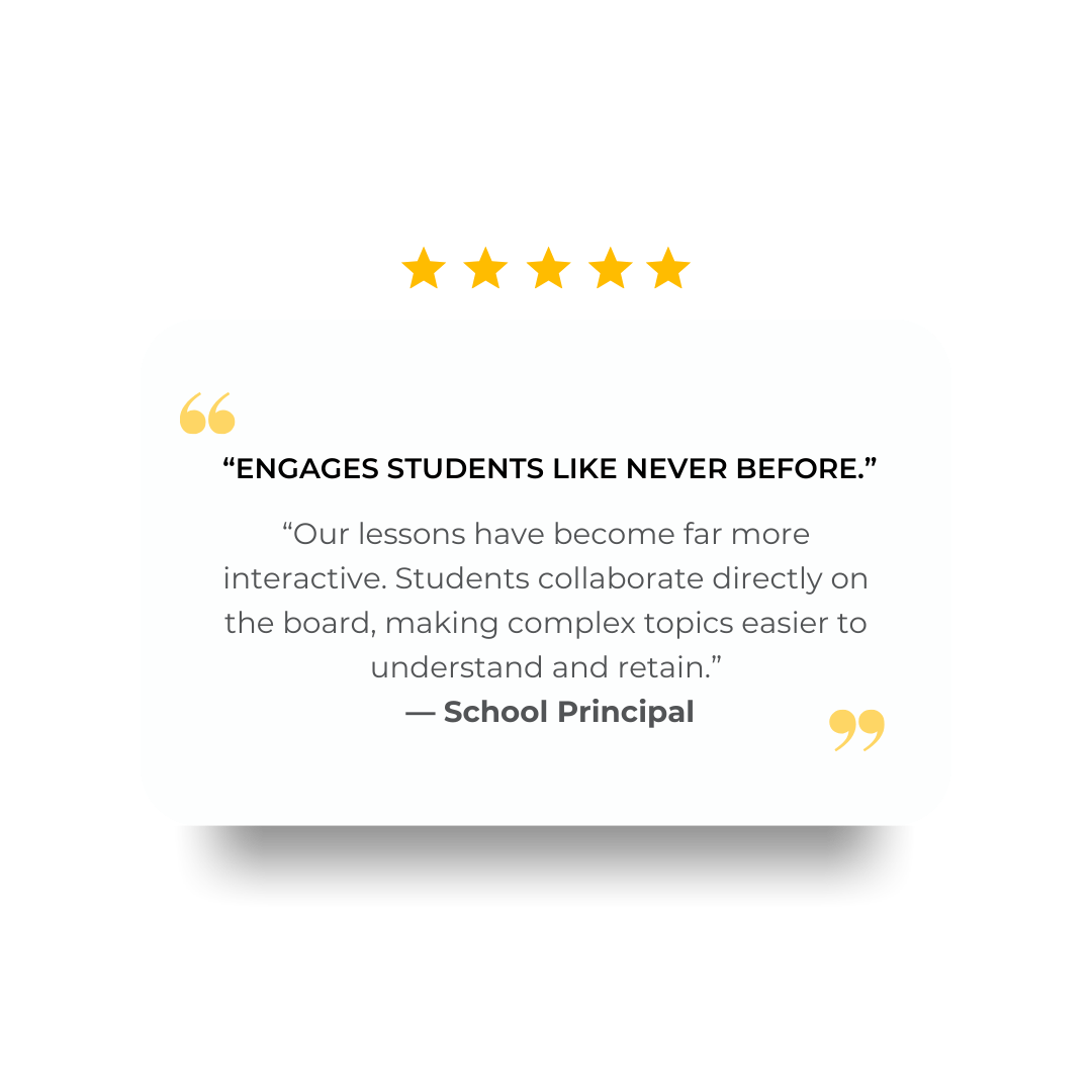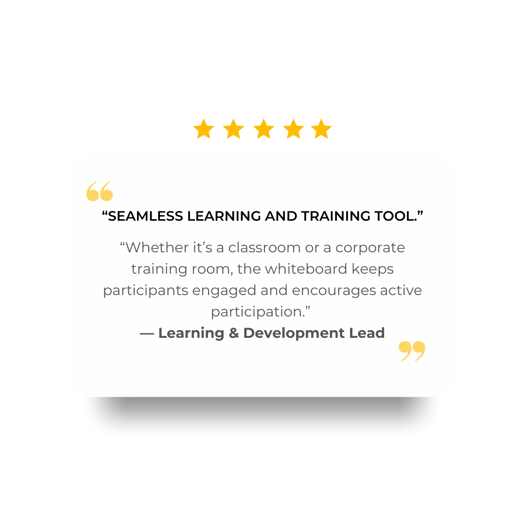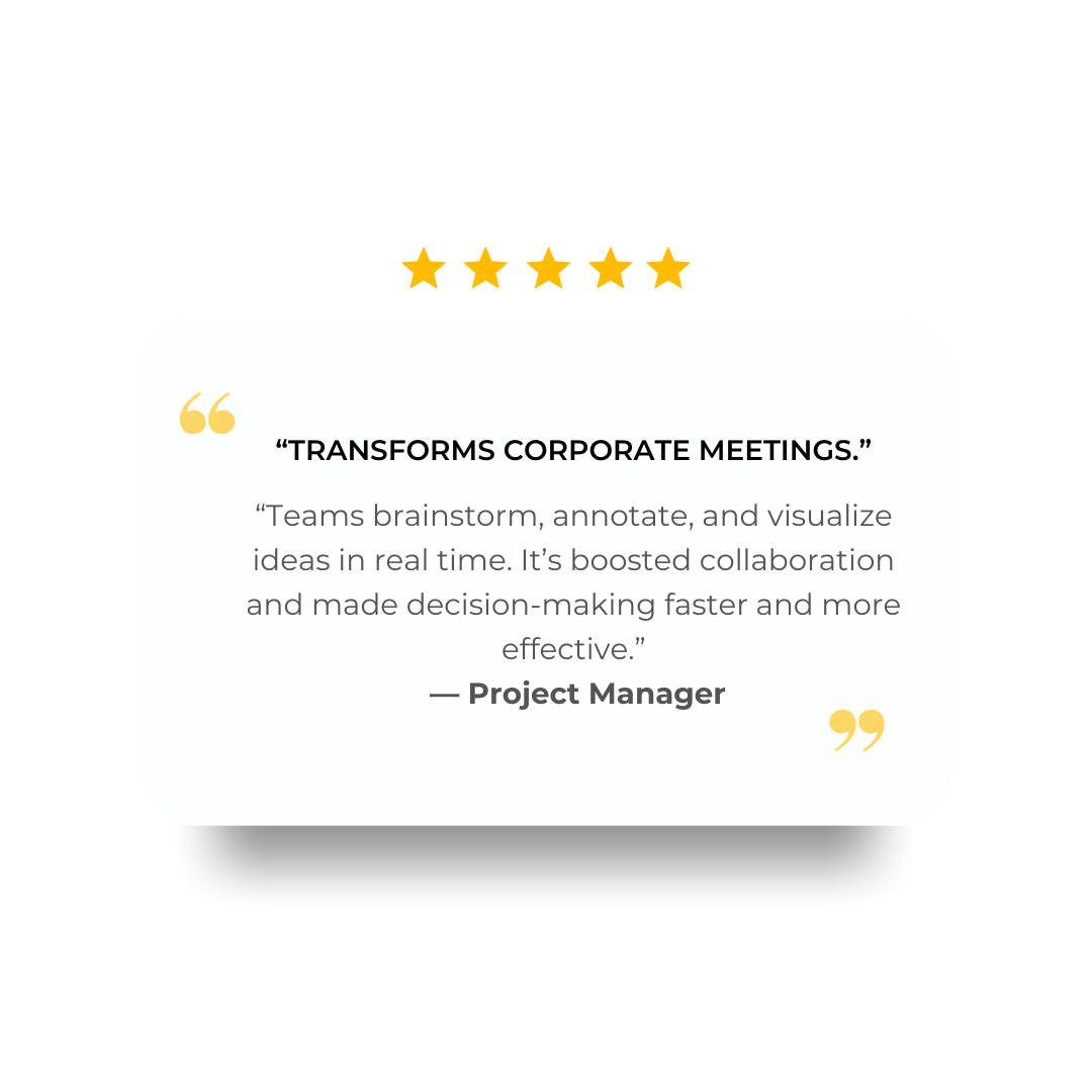 Interactive whiteboards turn meetings into dynamic, collaborative sessions. Teams can brainstorm, annotate, and share ideas in real time, boosting engagement, speeding decision-making, and driving results — all in one seamless workspace.